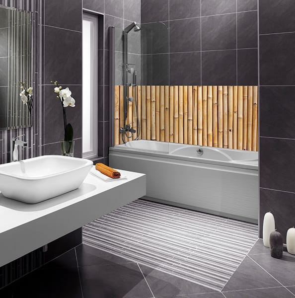 Pensée comme un décor mural fixe, elle permet de moderniser l’espace baignoire sans modification lourde, tout en installant une ambiance texturée naturelle.