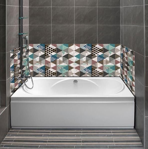 La crédence baignoire Marbre graphique apporte une touche décorative audacieuse autour de la baignoire grâce à un jeu de motifs géométriques associés à un effet marbre. Les formes structurées organisent le mur tandis que le veinage marbré apporte une élégance minérale.