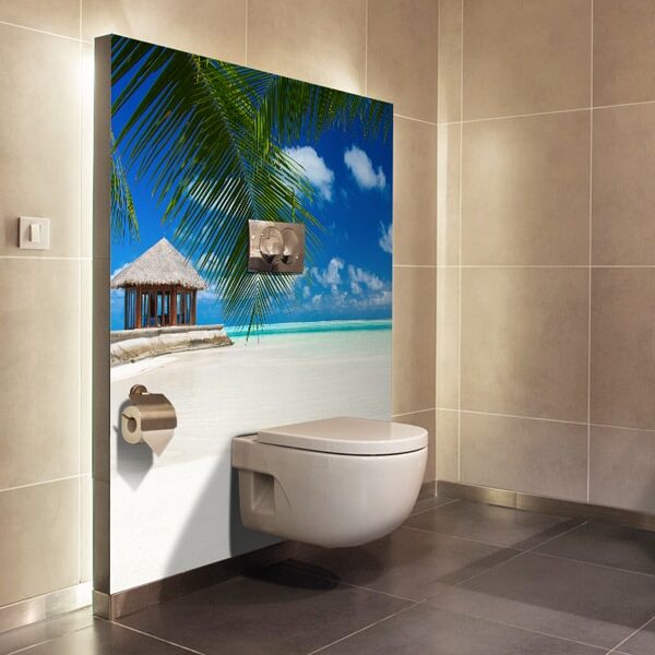 Le panneau mural salle de bains blue lagon transforme l’espace en un décor aquatique lumineux et apaisant. Les nuances de bleu et de turquoise créent une sensation de fraîcheur immédiate, tandis que la profondeur visuelle du décor ouvre la pièce et allège l’atmosphère.