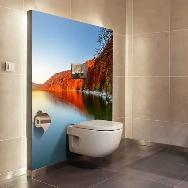 Le panneau mural salle de bains lac d’automne transforme la pièce grâce à un décor naturel chaleureux et apaisant. Le lac calme, les reflets doux et les couleurs orangées de la saison créent une atmosphère enveloppante qui invite à ralentir.
