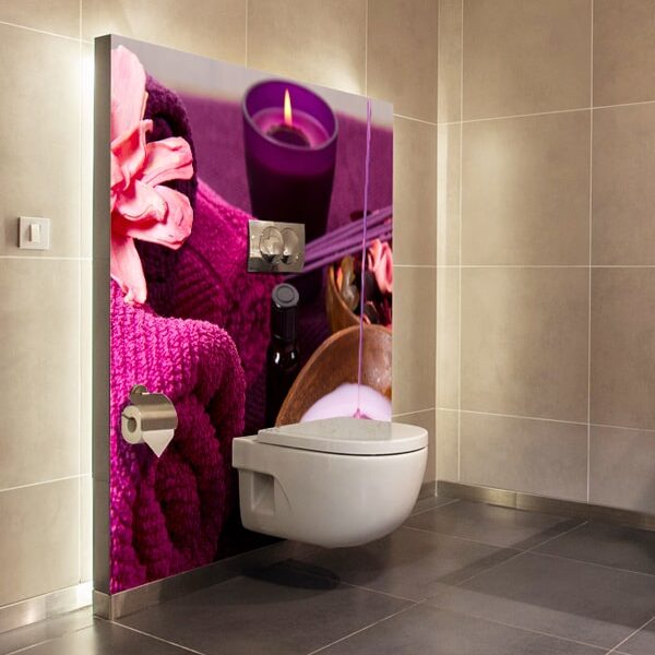 Le panneau mural salle de bains ambiance spa transforme la pièce en un espace de détente inspiré des rituels bien-être. La lumière tamisée, les bougies et les éléments de soin créent une atmosphère chaleureuse et enveloppante, idéale pour ralentir et profiter d’un moment pour soi.