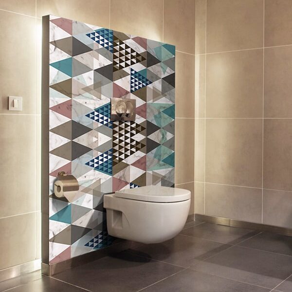 Le panneau mural salle de bains Marbre graphique apporte une identité décorative forte grâce à l’association d’un effet marbre et de motifs géométriques structurés. Les formes graphiques rythment le mur tandis que le veinage marbré apporte une profondeur minérale élégante.