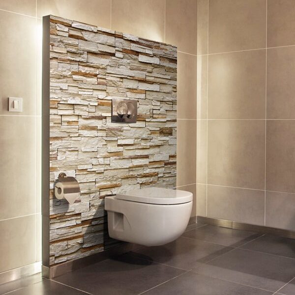 Le panneau mural salle de bains pierre moderne transforme la pièce grâce à un décor minéral au style contemporain. L’effet pierre empilée apporte de la texture, du relief et une sensation naturelle qui structure immédiatement l’espace. Les tons beiges et sable créent une ambiance chaleureuse et élégante, facile à associer à des matières claires ou à une robinetterie moderne.