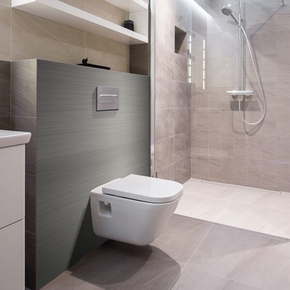 Le panneau mural salle de bains inox brossé affirme le caractère de l’espace grâce à un effet matière métallique inspiré de l’inox brossé. Les lignes marquées et le rendu visuel plus dense créent une profondeur graphique qui structure le mur et capte subtilement la lumière.